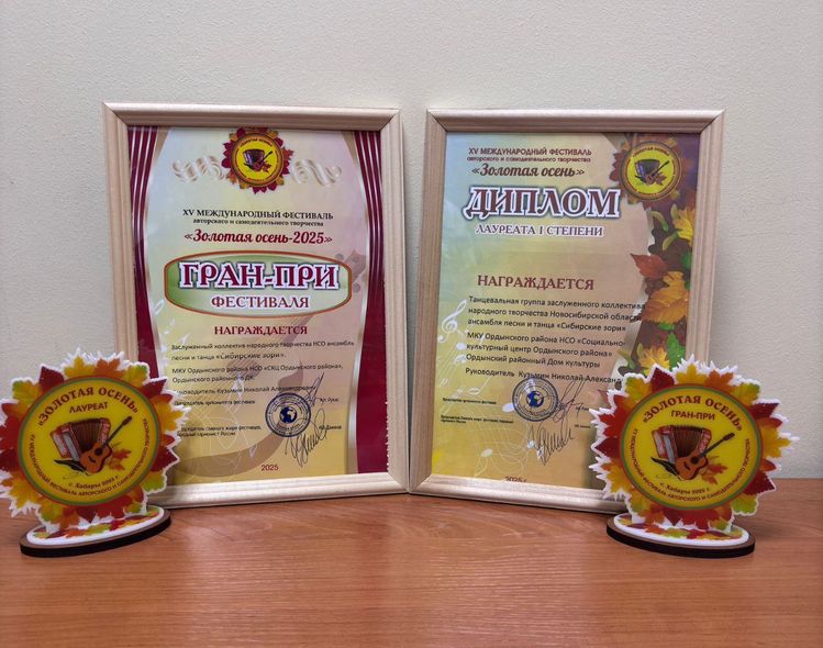 Не устаёт нас радовать своими успехами заслуженный ансамбль песни и танца «Сибирские Зори». На этот раз знаменитый коллектив порадовал поклонников, завоевав высшую награду на 15-ом международном фестивале авторского и самодеятельного творчества «Золотая осень – 2025», проходившем в соседнем регионе в поселке Хабары.