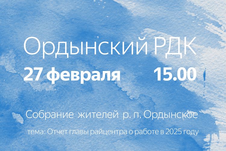 27 февраля в 15.00 в Ордынском РДК состоится собрание жителей райцентра. Тема: отчет главы р. п. Ордынское Сергея Семенова о проделанной в 2025 году работе.