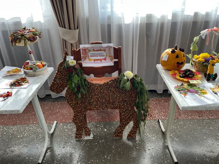На выставке можно было увидеть разнообразие творений: лесные зверята, уютные домики на опушке леса, а также трактор с прицепом, набитым осенью собранным урожаем. Особое внимание привлекла самая большая поделка — конь, выполненный из дубовых желудей, которую принесла семья Шнайдер. Это произведение демонстрировало не только мастерство, но и креативный подход к использованию природных материалов.