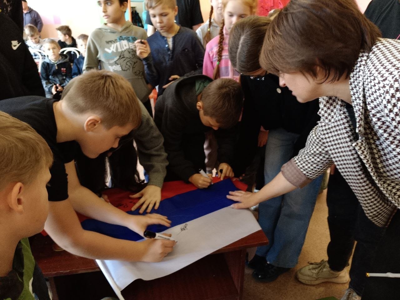 Завершились встречи торжественным вручением триколора. На одном ребята и гости написали пожелания для солдат, которые «Рамоз» доставит в свой батальон. А на другом «Рамоз» написал пожелания для нашей школы.