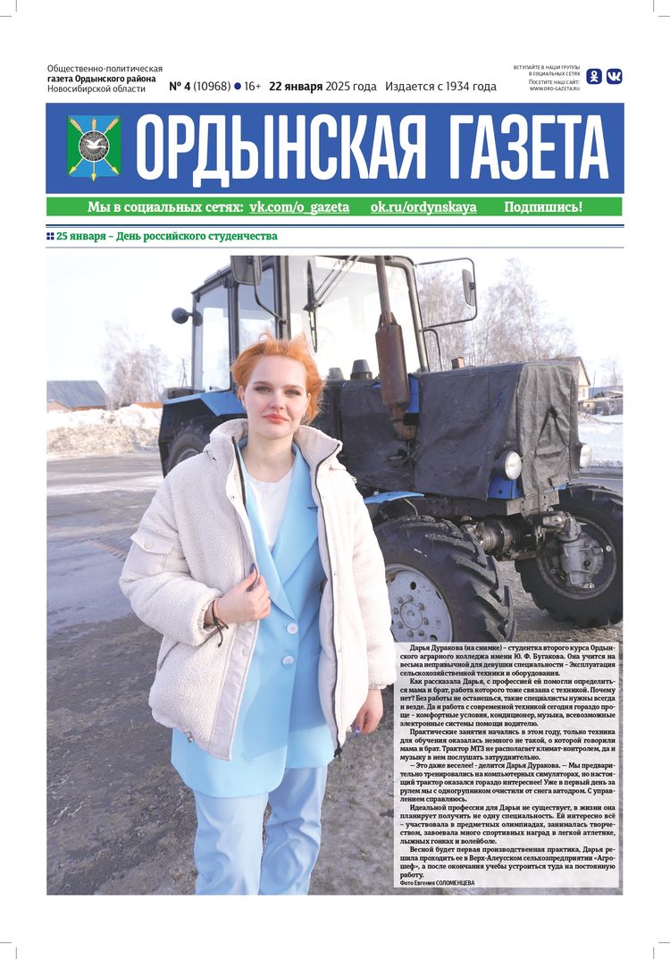 Про студентку третьего курса специальности «Эксплуатация и ремонт сельскохозяйственной техники и оборудования» Дарью Дуракову «Ордынская газета» рассказывала ни раз. А в январе 2025 года Дарья стала героиней первой полосы («ОГ» № 4 от 22.01.2025 г.) и видео-ролика в социальных сетях районной газеты.