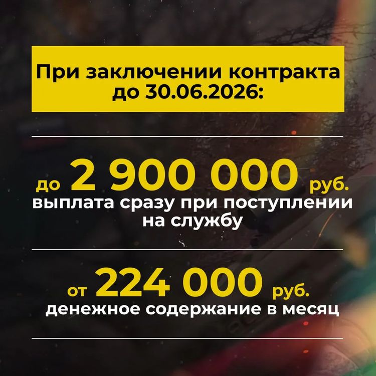 При заключении контракта до 30 июня 2026 года в Новосибирской области выплата сразу при поступлении на службу — до 2,9 млн рублей, а денежное ежемесячное содержание — от 224 000 рублей. Для мужчин от 18 до 46 лет годных по […]