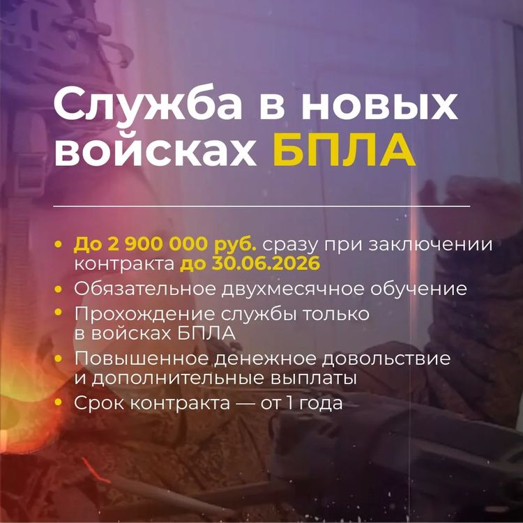 Для мужчин от 18 до 46 лет годных по состоянию здоровья — служба в новых войсках БПЛА. Сразу при заключении контракта выплата также составит до 2,9 млн рублей.